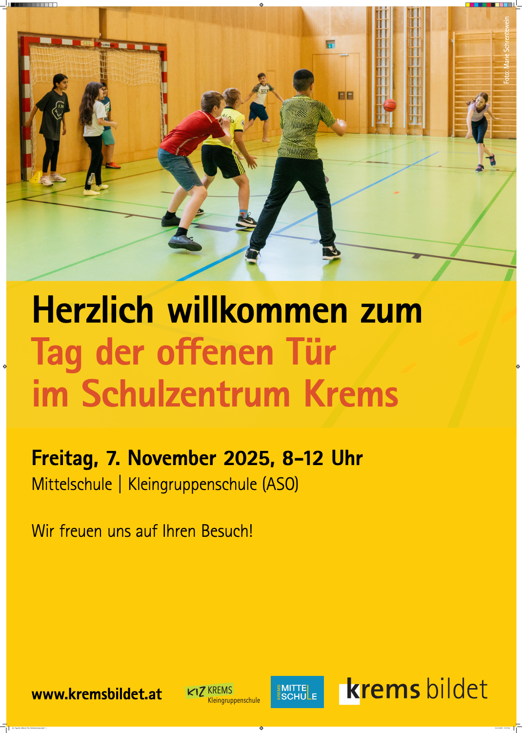 Am Freitag, den 7. November 2025, lädt die Mittelschule Krems alle interessierten Kinder, Eltern und Besucher herzlich zum Tag der offenen Tür ein! Von 8:00 bis 12:00 Uhr bietet sich die ideale Gelegenheit, unsere Schule kennenzulernen, Einblicke in den Unterricht zu gewinnen und das vielfältige Angebot selbst zu erleben.