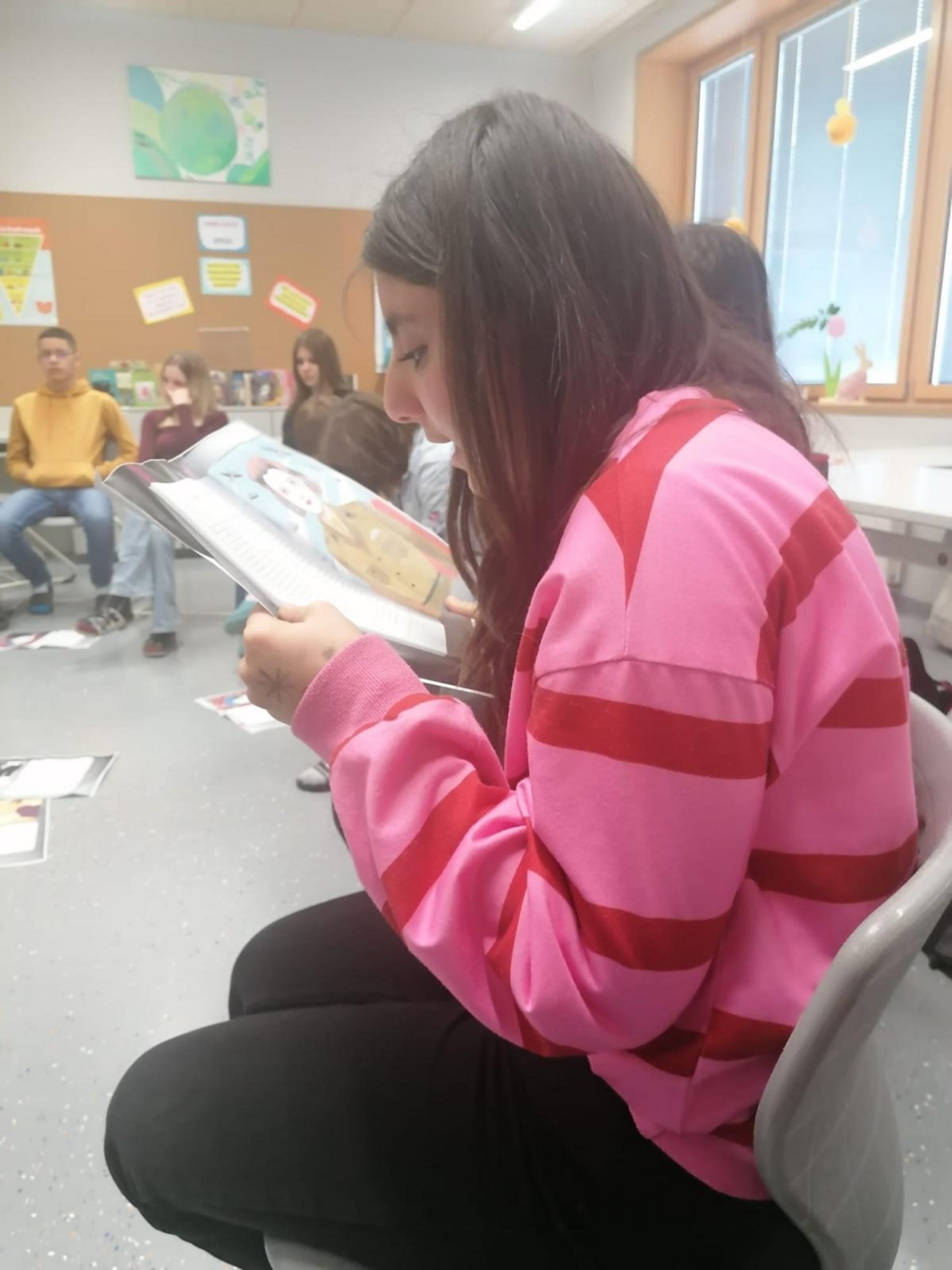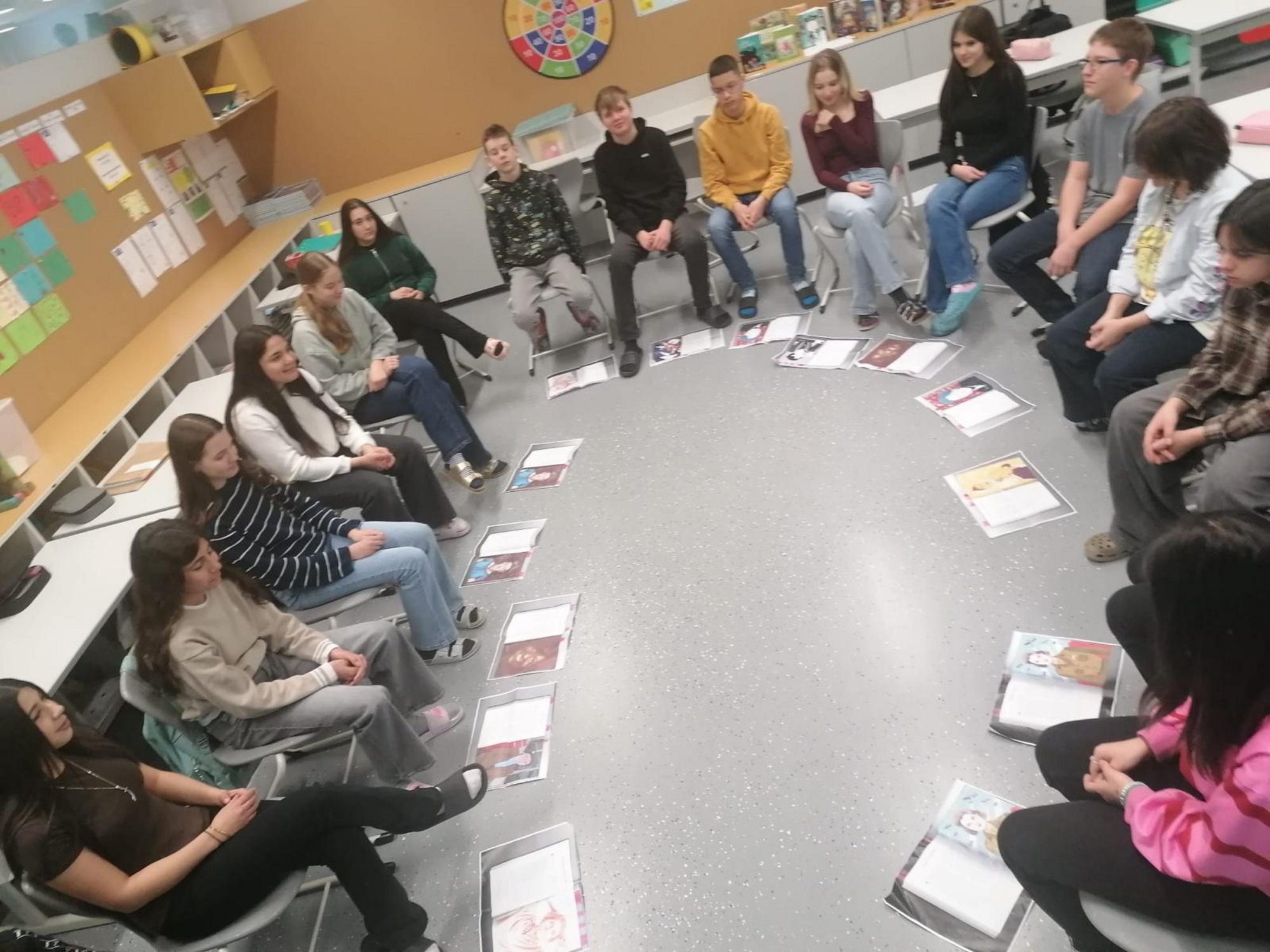 Unsere Jugendlichen, lasen sich gegenseitig in entspannter Atmosphäre, selbstgeschriebene Charakteristika und Geschichten über beeindruckende Künstler:innen, historische Persönlichkeiten, Frauen und Männer aus den verschiedensten naturwissenschaftlichen Bereichen, dem Sport und aus dem Alltag, vor.